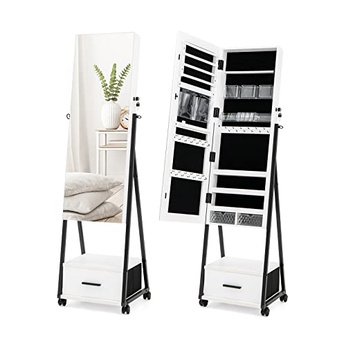 COSTWAY Armoire à bijoux avec miroir, armoire à bijoux, miroir avec tiroir, sur roulettes, verrouillable, sur pied, 42 x 38 x 157 cm, blanche