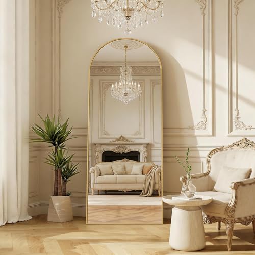 Dewfig Miroir pleine longueur arqué, 165,1 x 55,9 cm, grand miroir de sol avec support, miroir sur pied pour chambre à coucher, salon, dressing, cadre en alliage d'aluminium, doré