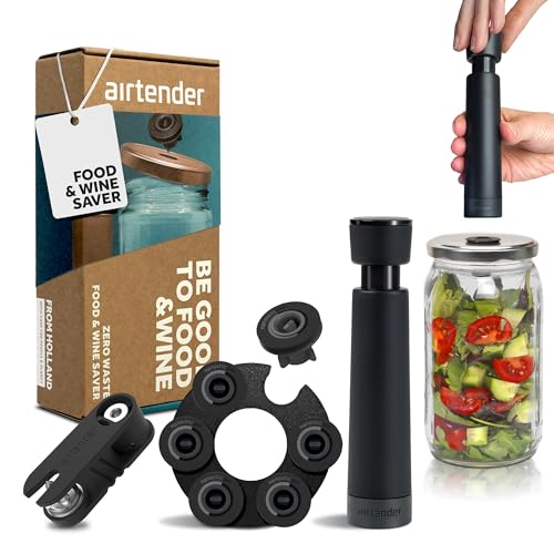 Set de mise sous vide Airtender – Conservez vos aliments et boissons jusqu’à 5 fois plus longtemps, sans BPA, matériaux durables. Inclus : pompe à vide, 6 bouchons à vin, coffret cadeau.