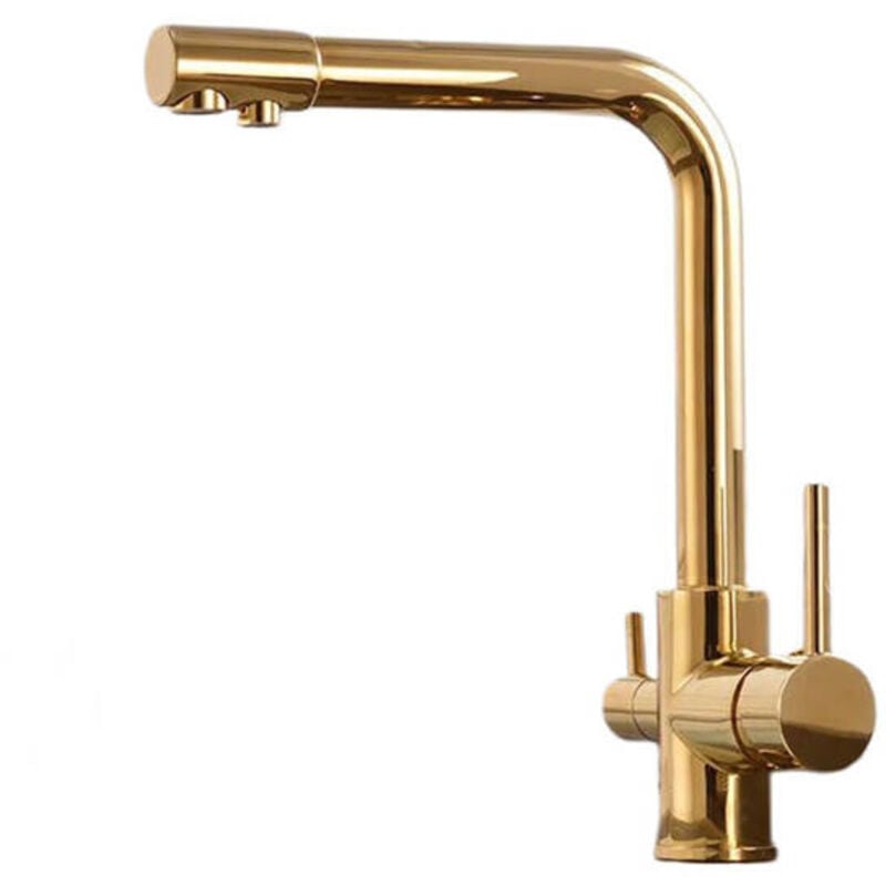 LYGSWDB Robinet de Cuisine avec Sortie d'eau Potable filtrée, évier de Cuisine pivotant à 360°, Robinet mitigeur de Cuisine en Laiton Massif pour Eau Froide Chaude avec 2 poignées, doré (Cromo)