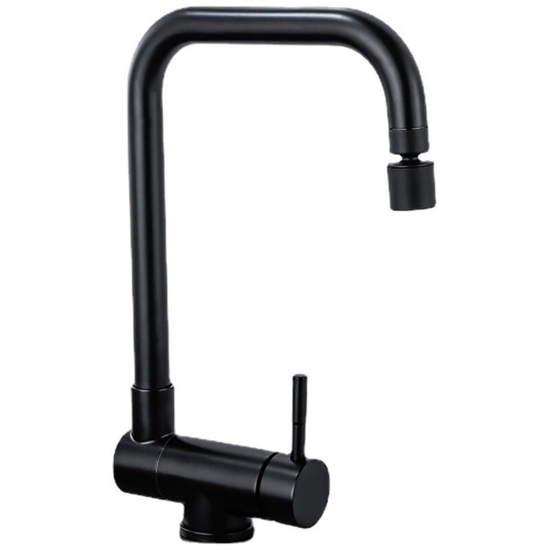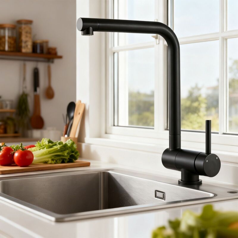 Mitigeur de cuisine rabattable, repliable sous fenêtre, bec haut pivotant 360°, aérateur démontable, finition noir mat