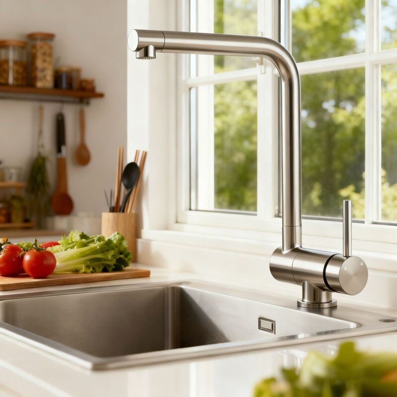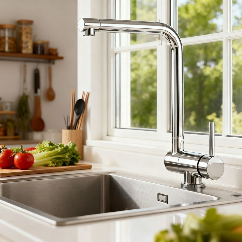 Mitigeur de cuisine rabattable, repliable sous fenêtre, bec haut pivotant 360°, aérateur démontable, finition chromée brillante