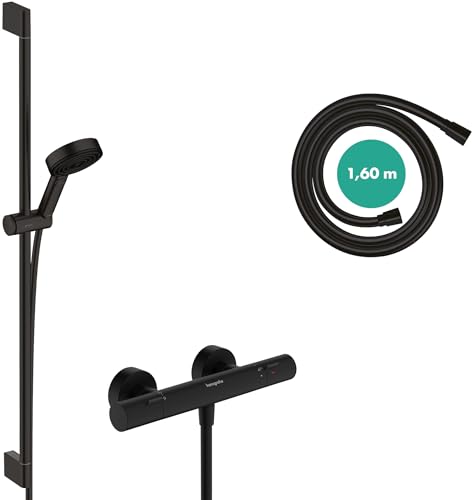 hansgrohe Pulsify S - Set de douche économie d'eau (EcoSmart+), Ensemble de douche avec mitigeur thermostatique Ecostat Fine, Douchette, Barre douche 65cm, Flexible 160cm, Support, Noir mat, 24262670