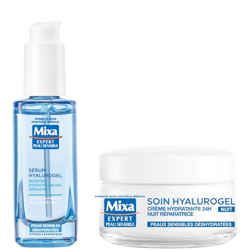 Lot de Mixa Expert Peau Sensible - Sérum Hyalurogel - Booster Hydratation 24h Repulpant + Mixa Expert Peau Sensible - Hyalurogel Nuit - Crème-Masque Hydratante - Sommeil Réparateur - 50 ml - Lot de 1