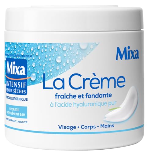 Mixa Intensif Peaux Sèches - La Crème Fraîche et Fondante à l’Acide Hyaluronique Pur - Multi Usages Visage, Corps, Mains, Pieds - Hydratation 24h - Pénétration rapide - Hypoallergénique - Pot 400ml