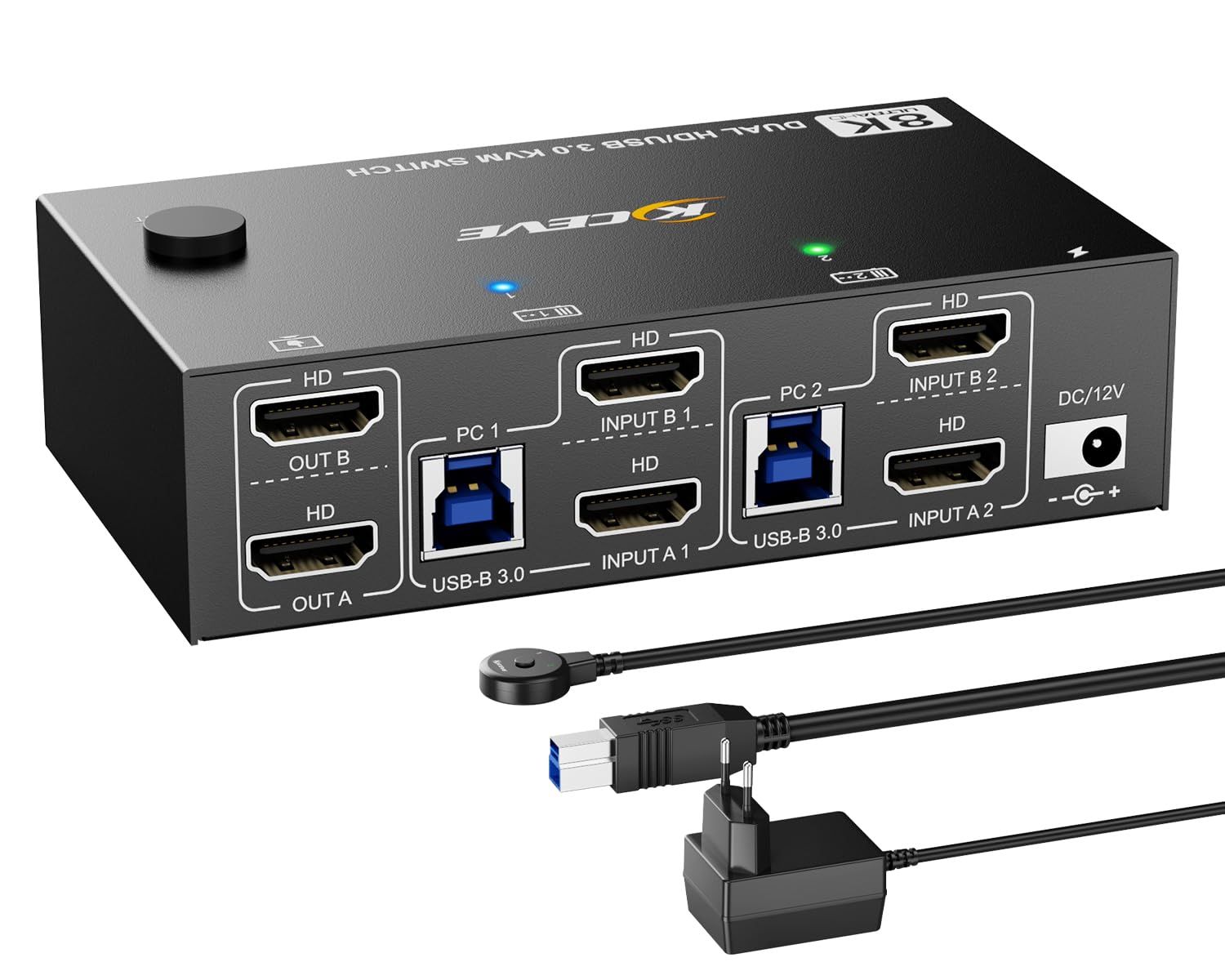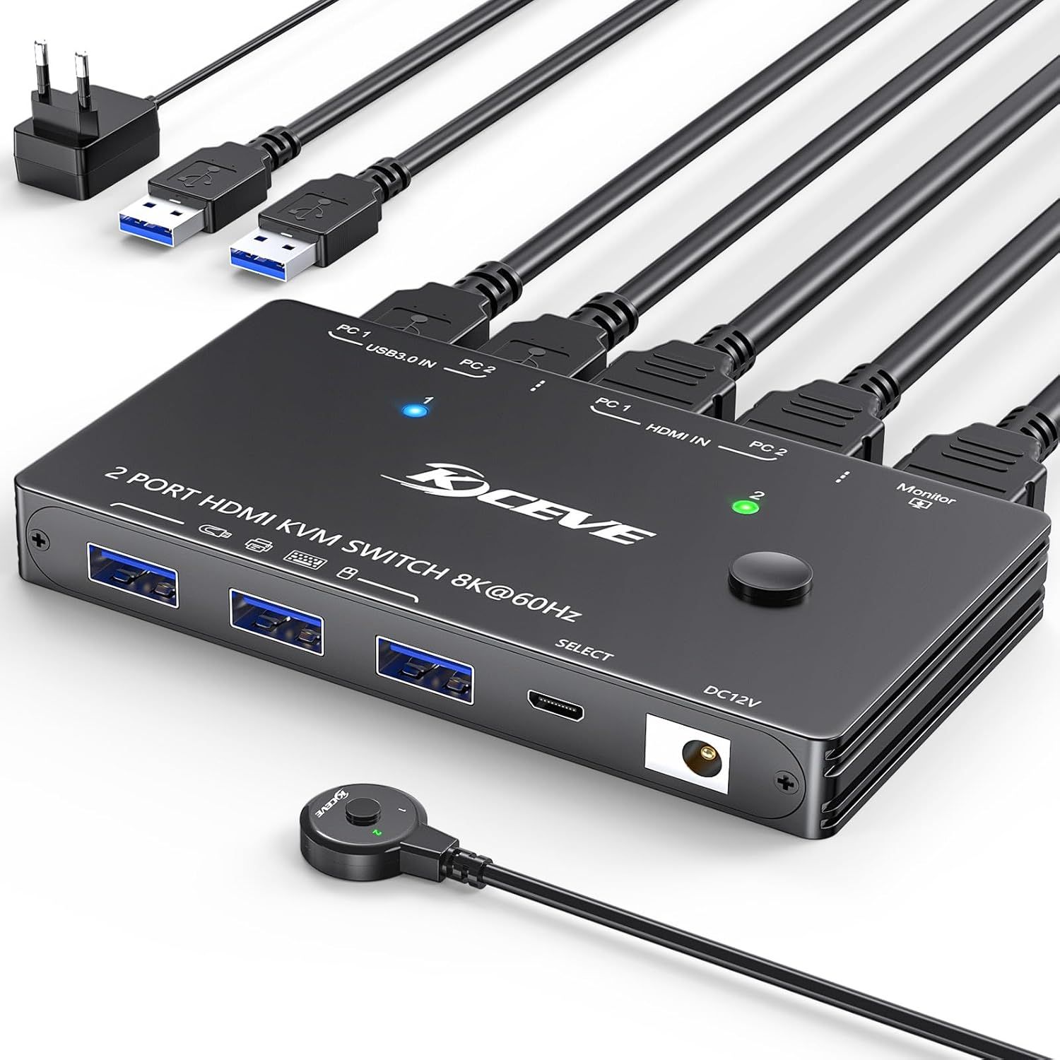 Commutateur Kvm Hdmi 2 Pc 1 Moniteur 4K @ 144Hz 8K @ 60Hz,2X1 Commutateur Kvm Hdmi 2 Ports Pour 2 Ordinateurs Partager 1 Moniteur Et 3 Périphériques Usb 3.0,Avec Télécommande Filaire,Câble