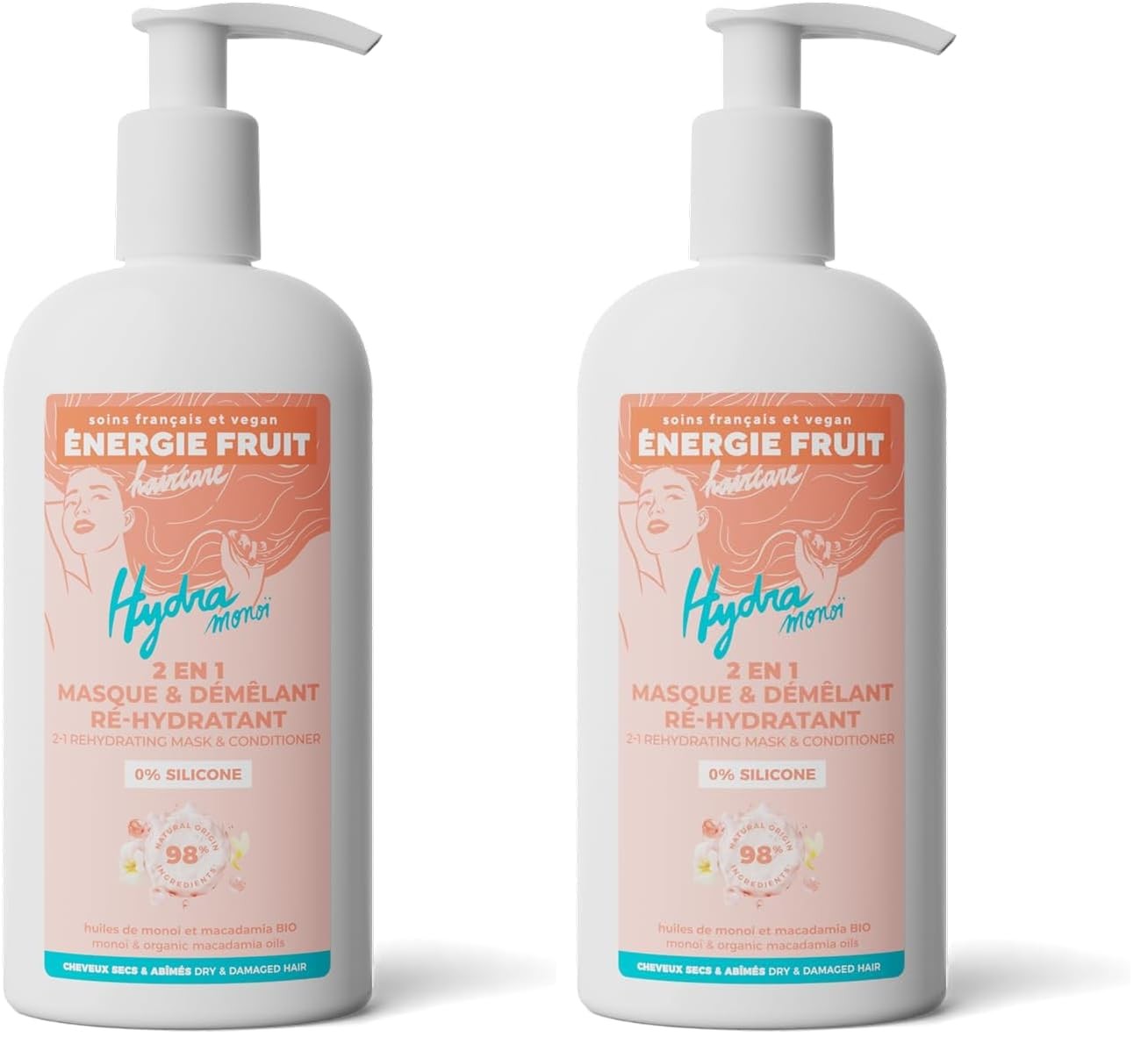 ENERGIE FRUIT | Masque + Démêlant Hydratant Format Voyage | Monoï & Macadamia | Cheveux Secs et Abîmés | Vegan | 75ml (Lot de 2)
