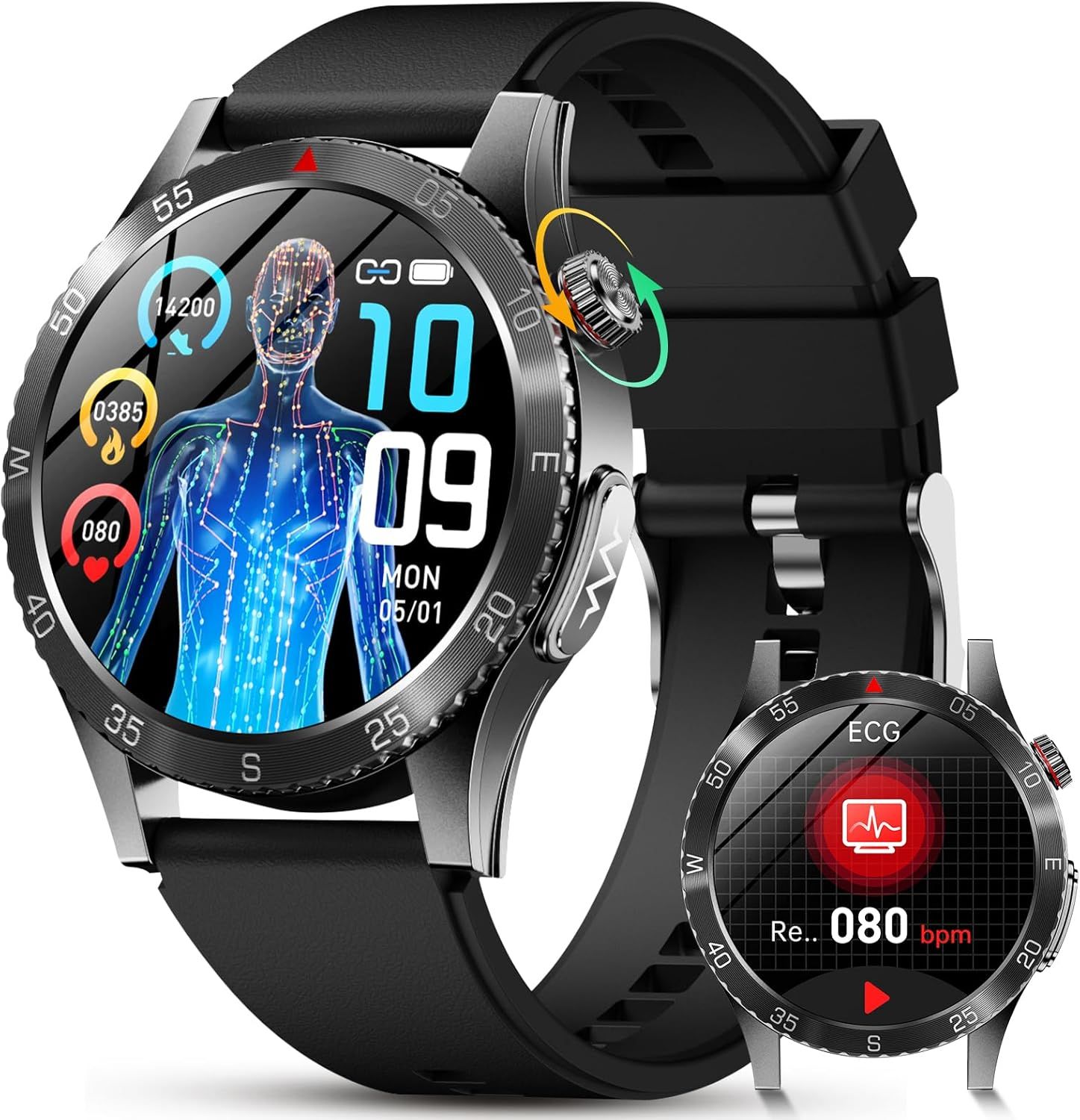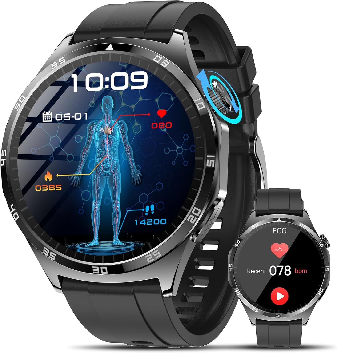 Montre Connectée Homme ECG avec Micro Hautparleur Boîtier Alliage Rond Étanche IP67 Écran Tactile Bracelet Silicone Noir