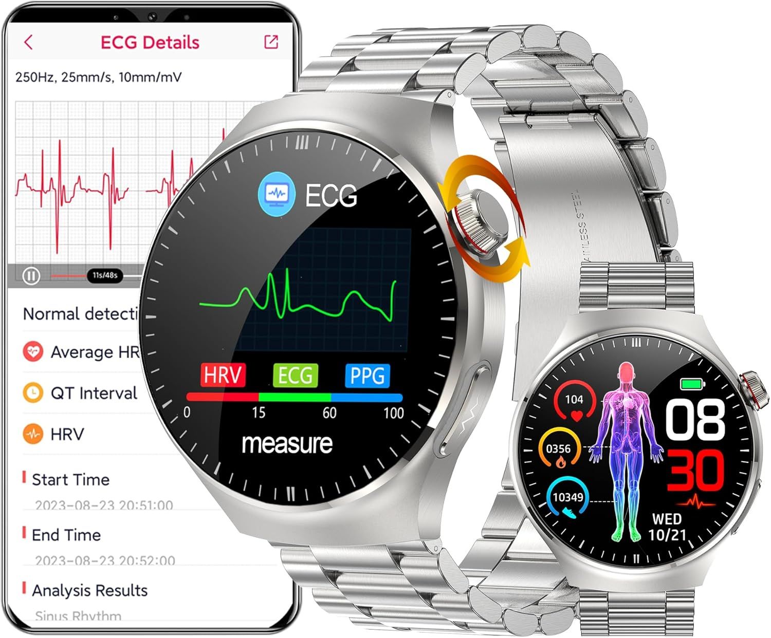 Montre Connectée Ecg+Ppg Pour Femmes,Écran Entièrement Tactile,Fréquence Cardiaque,Sport,Fitness,Appel Vocal,Étanche,Avec Boîte,Nouveau,2024.White Steel Strips.