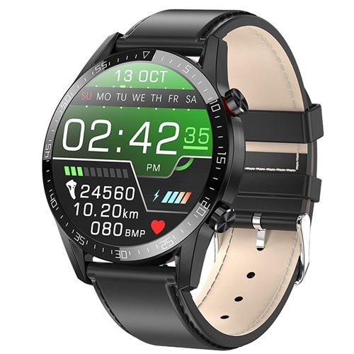 Montre Connectée Homme ECG avec Micro Hautparleur Boîtier Alliage Rond Étanche IP67 Écran Tactile Bracelet Similicuir Argent-Noir