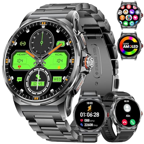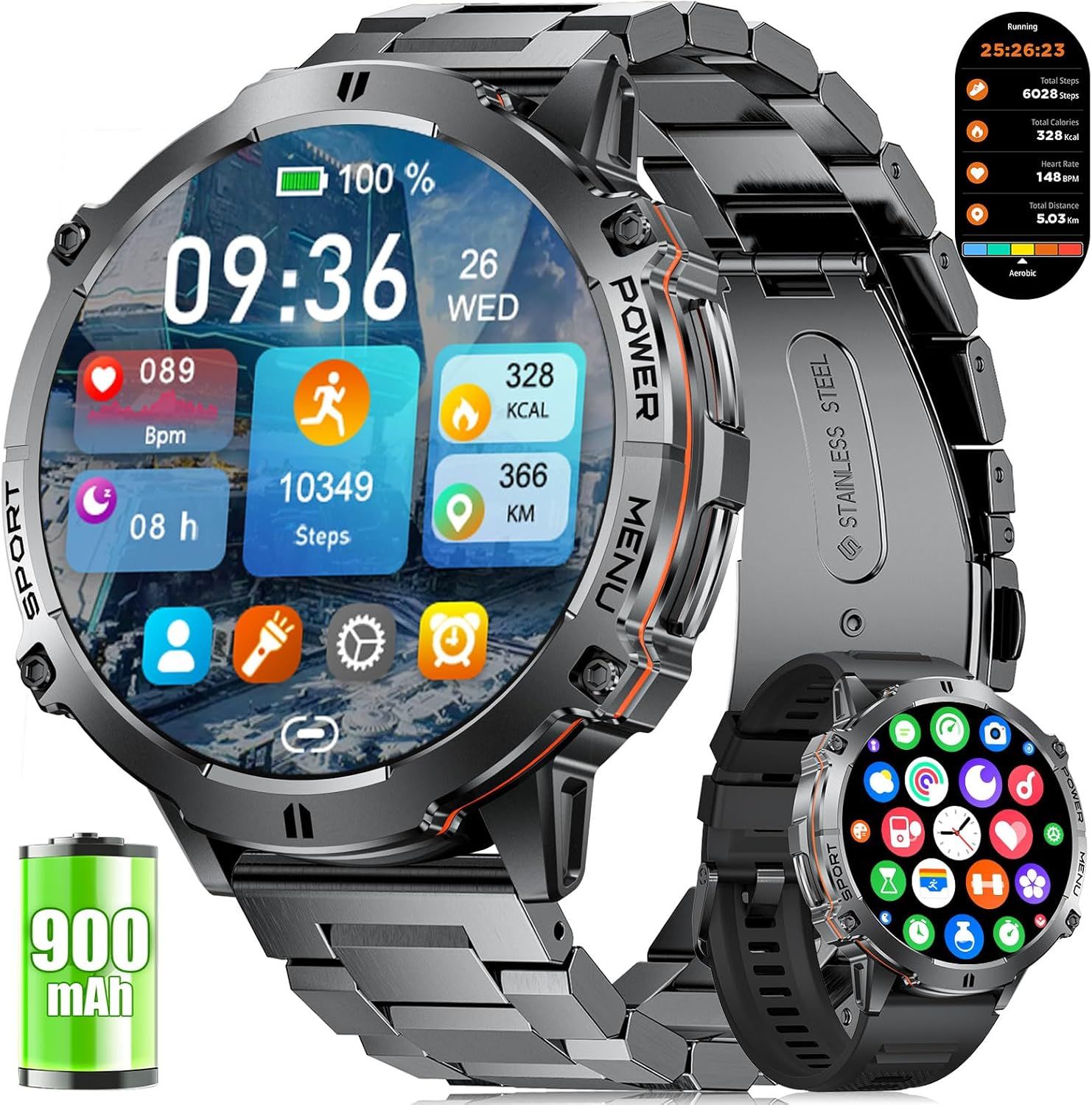 Montre Connectée Homme Militaire, Appel Bluetooth Smartwatch avec 1.43"AMOLED Écran/800 Batterie, 170+Modes Sportifs, IP68 Étanche Fréquence Cardiaque/Suivi du Sommeil pour Android iOS, Acier