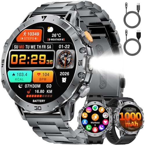 1000mAh Batterie Montre Connectée Homme Militaire,1.7'' HD Écran/LED Lampe,Smartwatch Homme avec Appel Bluetooth,100+ Modes Sport,Fréquence Cardiaque/Suivi du Sommeil,IP68 Montre pour Android/iOS