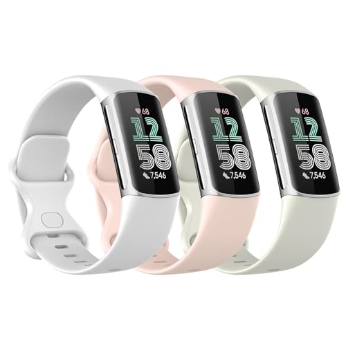 Astorgos 3 Pièces Bracelet de Montre Compatible avec Fitbit Charge 6/Fitbit Charge 5 pour Femme Homme, Bracelet de Remplacement en TPE Souple, Rose Sable/Blanc Lune/Blanc