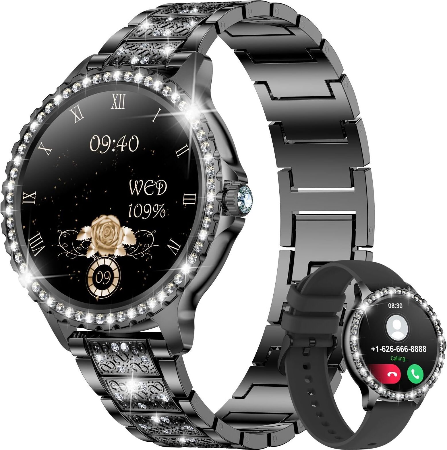 ASVIL Montre intelligente pour femme avec diamants (répondre/passer un appel), montre intelligente HD de 3,4 cm avec voix AI pour iPhone et téléphones Android, traqueur de fitness avec moniteur de