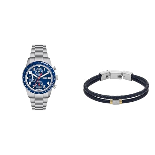 Fossil Montre Homme Sport Tourer en Acier Inoxydable Argent et Bracelet Jewelry Cuir Bleu, Set