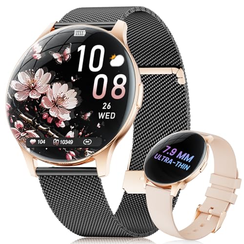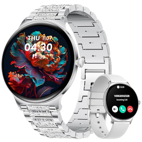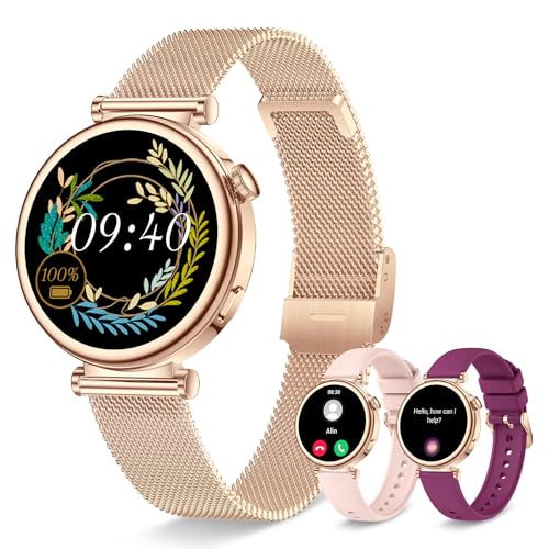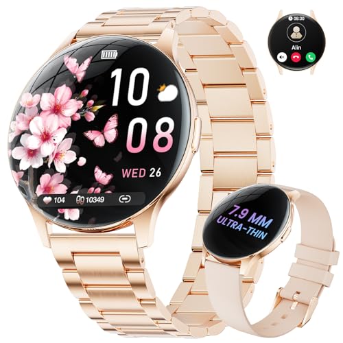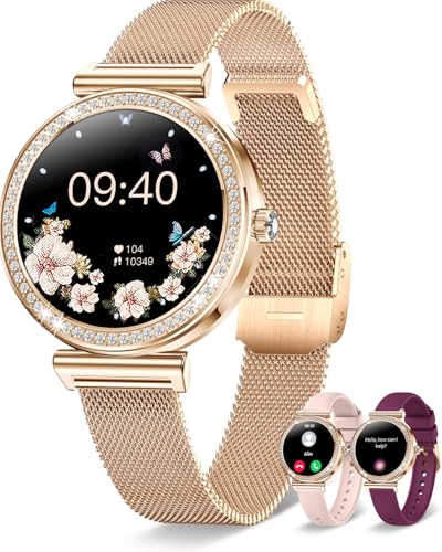 Erkwei Montre Connectée Femme Ronde avec Appel Bluetooth 3 Bracelets 41mm/1.27" Petite Smartwatch Femme pour Android iOS Podomètre Fréquence Cardiaque Suivi Sommeil Strass Brillants, Or Rose