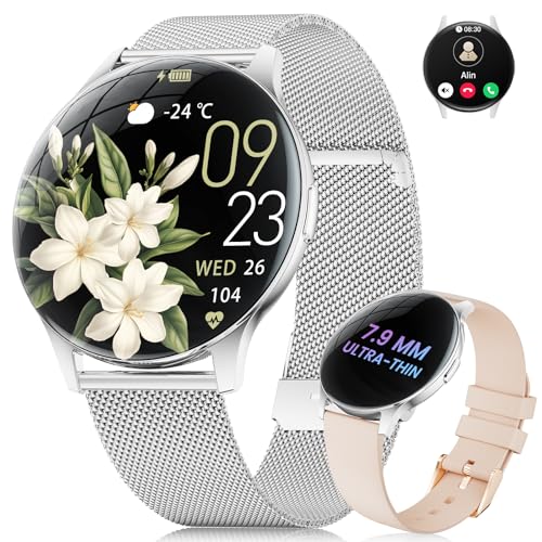 Montre Connectée Femme avec Appel Bluetooth, Smartwatch Ronde 1,27" 41mm pour Petit Poignet, 3 Bracelet, 100 Modes Sport Suivi Sommeil Fréquence Cardiaque Podomètre, Compatible Android iOS (Argent)