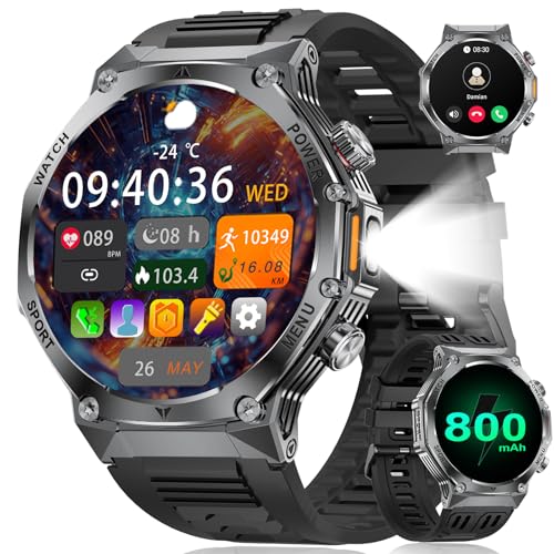 Montre Connectée Homme 1,52"HD Écran Smartwatch, 500 mAh Batterie et 120+ Modes Sportifs, Montre Connectée Militaire avec Fréquence Cardiaque/SpO2/Sommeil Moniteur et Lampe De Poche pour Android iOS