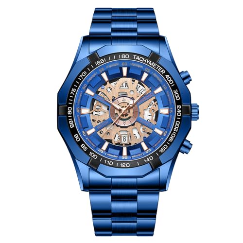 JewelryWe Montre Homme Analogique Quartz: Montre Bracelet Acier Inoxydable Imitation Mécanique Étanche 3ATM avec Aiguilles et Index Lumineux, Tachymètre, Calendrier - Six Couleurs Disponibles