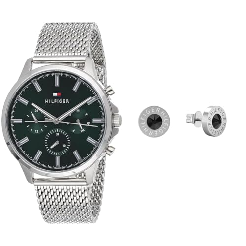 Tommy Hilfiger Montre Analogique Multifunction à Quartz pour Homme avec Bracelet milanais en Acier Inoxydable argenté + Jewelry Clous d'oreilles pour Homme en Acier inoxidable avec Cristaux - 2790379