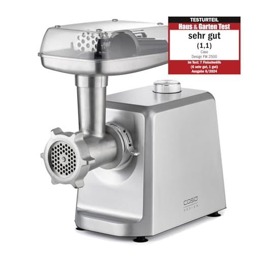 CASO Hachoir à viande FW 2500 argenté, avec moteur puissant de 2500 W, lame en titane durable, fonction de retour, nombreux accessoires avec presse à hamburger, moteur CC silencieux