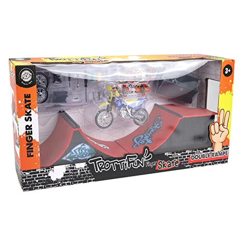 TROTTIFUN - Set 2 Finger Skates, Une Double Rampe et 1 Moto - 031460 - Métal et Plastique - Skateboard - Doigt - Jouet Enfant - Anniversaire - Cadeau - Planche à Roulette - À Partir de 3 Ans