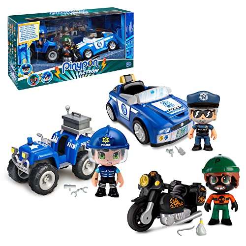 Pinypon Action - Pack Véhicules avec Quad, Voiture et Moto, et 3 Figurines différentes | 2 poupées policières et Un Voleur, Jouet Exclusif, pour garçons et Filles à partir de 3 Ans