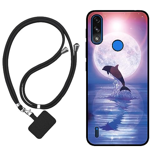 Sunrive Coque Compatible avec Motorola Moto E7i Power,TPU Étui Housse Protecteur Souple Gel Mat Back Cover Mignon Motifs Antichoc Case(Lune,Dauphins,mer)+1x Universelle Dragonne