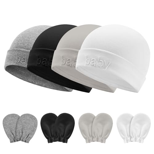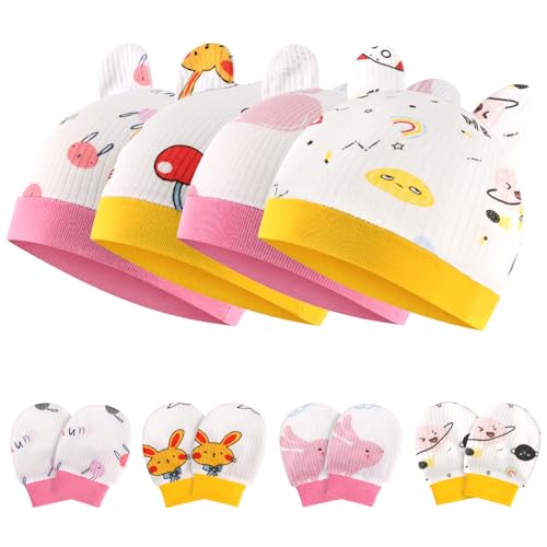 Aolso Moufle Bébé Naissance, 4pcs Bonnets de Naissance et Moufles de Protection Coton de Haute Qualité, pour Bébés 0-6 Mois, Bébé Fille Garçon