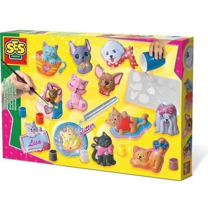 SES CREATIVE - Moulage en plâtre chiens et chats - Jaune vert et rose - Enfant - Plus de 5 ans