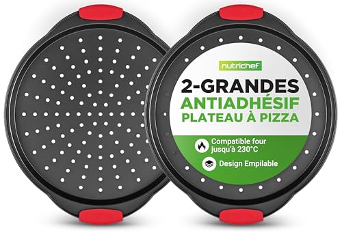 NutriChef Plaque Pizza, Moule à Pizza Antiadhésif, Plat Rond en Acier Perforé avec Bords en Silicone, Compatible Four, Passe au Lave-vaisselle, Noir