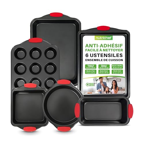 NutriChef, Moules à Pâtisserie, Lot de 6 Pièces avec Poignées en Silicone-Antiadhésifs, Moules à Cake-Muffins-Gâteau, Ronds-Carrés, Plaque à Biscuits,Passe au four, Noir