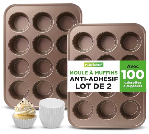 NutriChef Moules à Muffins, Pâtisserie pour Cuisson, Plaque à Cupcakes Antiadhésive, Moule Muffin, 2 Pièces avec 12 Cavités, Plateau Empilable en Acier au Carbone, Compatible Lave, Vaisselle, Doré