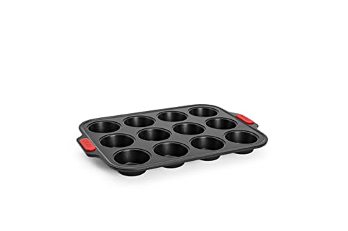 Woll Bakeware Lot de 12 moules à muffins avec poignées en silicone résistant à la chaleur jusqu'à 230 °C, sans PFAS, revêtement antiadhésif à double couche, acier aluminisé, noir