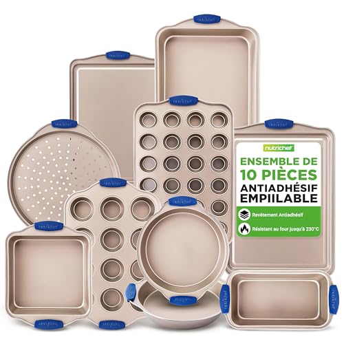 NutriChef ensemble de cuisson antiadhésif 10 pièces - acier au carbone avec poignées en silicone, comprend plaque à pizza, moule à pain, moules à muffins, moules ronds et plaques à biscuits