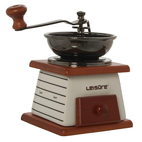 DRW Moulin à café manuel en céramique, bois et fer de couleur marron, blanc et métallique