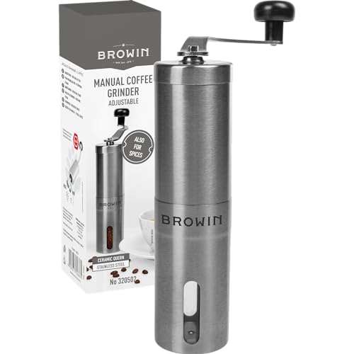 Browin 320502 Moulin à Café Manuel | pour Café, Sel et épices | en Acier | Réglage du Degré de Mouture | Argenté