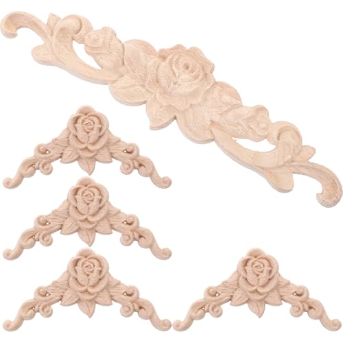 DOITOOL Appliques Décoratives en Bois Sculpté Européen, Angle en Bois Massif Non Peint, 5 Pièces pour Décoration Meuble, Moulure Décorative pour Armoires, Portes et Panneaux Cuisine