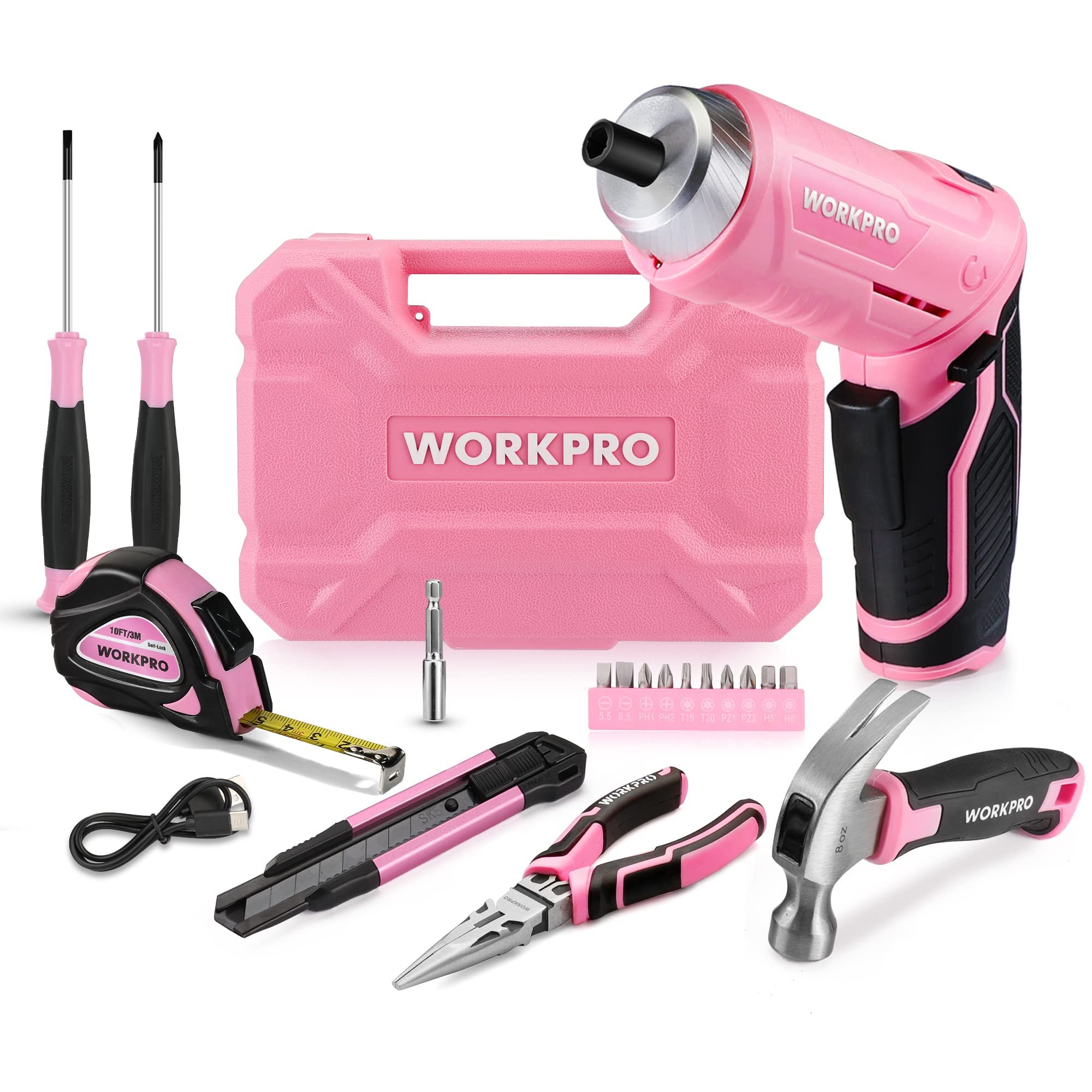 Caisse a Outils Rose 18 Pieces avec Tournevis Electrique 3,7 V WORKPRO, Trousse a Outils avec Boite de Rangement, Mallette a Outils pour Usage Domestique ou Petits Travaux