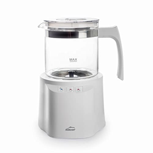 Lacor 69398 Mousseur à lait 3 en 1 avec récipient, base en acier inoxydable, couvercle hermétique et poignée ergonomique, sans BPA, 250 ml, blanc, verre