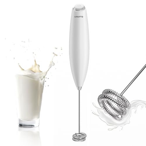 VINATO Mousseur à lait électrique, Mousseur à lait à piles avec Fouet en Acier Inoxydable, Mini-mousseur à café pour le café, le Latte, le Cappuccino, le Matcha et le Chocolat Chaud, Blanc