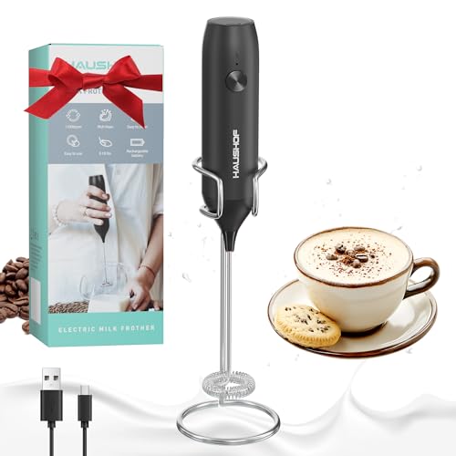 HAUSHOF Mousseur à Lait Électrique, Mousseur de Lait Portable avec Support, Rechargeable via USB, pour Café, Latte, Cappuccino, Matcha, Noir