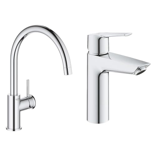 GROHE Robinet de cuisine évier Start, bec haut, rotation bec 360°, robinet installat & QUICKFIX Start Robinet de salle de bains lavabo, installation facile, mousseur économie d'eau, sans tirette