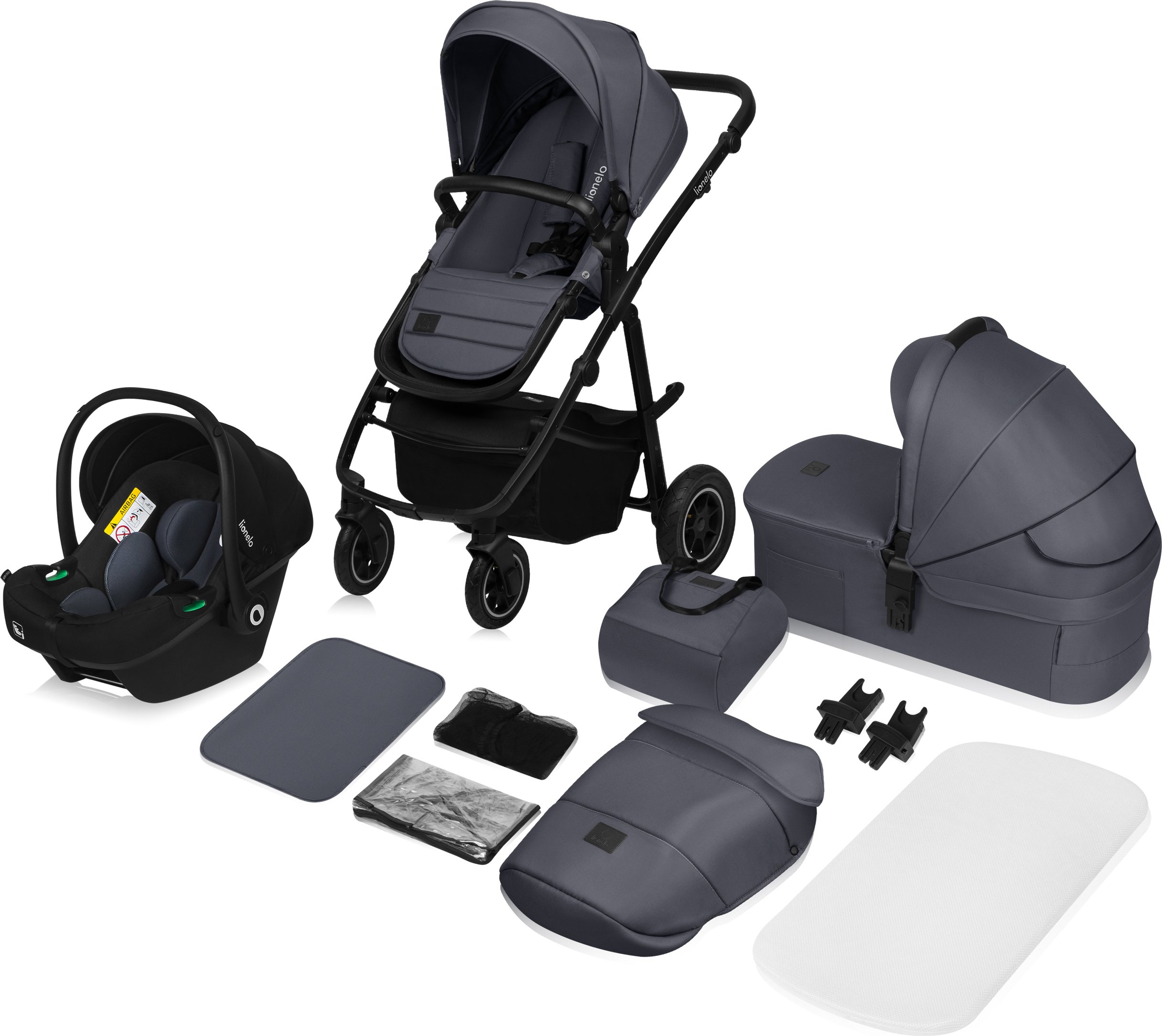 Lionelo Amber Plus - Poussette combinée 3 en 1 - Set sportif, siège, nacelle fixe, siège auto, sac, moustiquaire, habillage pluie - Grey Graphite