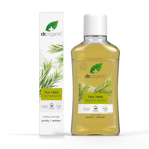Dr Organic Tea Tree Pâte à dents 100 ml & Mouthwash 500 ml – Sans alcool, naturel, Bad Breath & Healthy Gums, paraben & SLS Free, végétalien