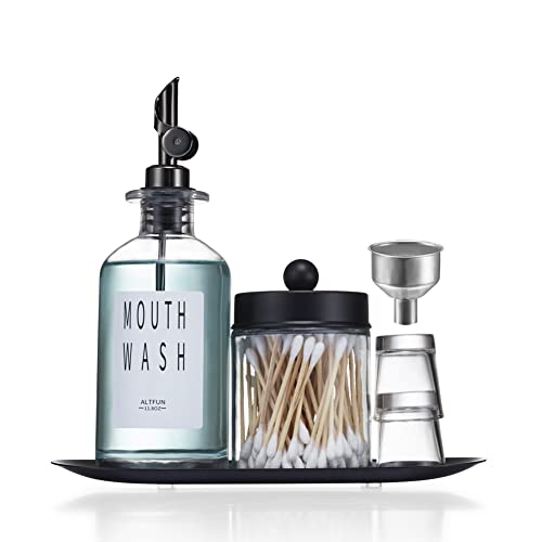 Altfun Glass Mouthwash Dispenser for Bathroom with Cups, Style Mouthwash Container Bottle with Qtip Holder,Glass Bottle 11.8oz Refillable Mouthwash Dispenser with Tray Funnel, Black