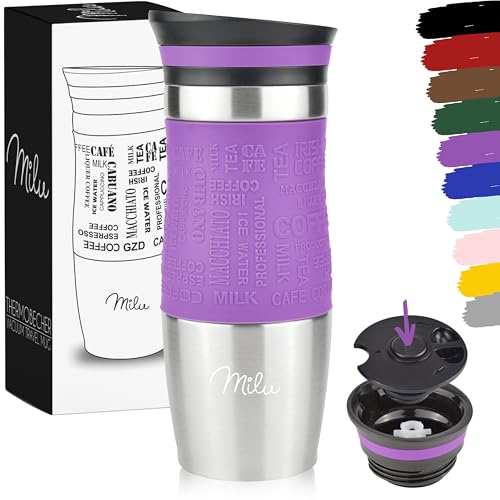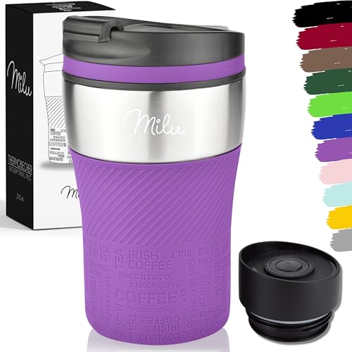 Milu Mug Isotherme Etanche 370ml, 450ml I Thermo Café-Thé I Tasse isolée pour café et thé à emporter, Double Paroi Isolée sous Vide, Acier Inoxydable I Tasse de voyage Chaud & froid (370ml, Pourpre)