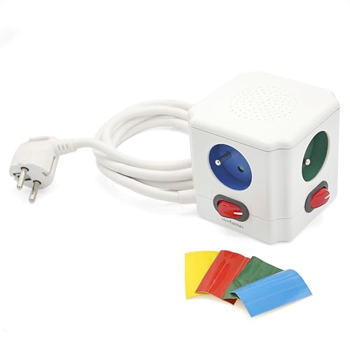 FISHTEC - Cube Multiprise Electrique 4 Prises Couleur avec Interrupteur Individuel pour Chaque Sortie - 12 Stickers Inclus - Cable 1.5m - Blanc