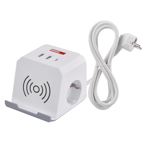 EMOS Cube multiprise avec Station de Charge USB et QI, 2 Prises Schuko, 2 Ports USB-A, 1 Port USB-C, 1 Station de Charge Qi avec Support pour téléphone Portable, câble de 2 m, Protection renforcée