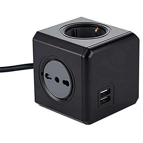 Electraline 62099 Multiprise Cube Powercube 4 Places avec 2 USB 2.1A, 2 Schuko + fiche Italienne, 2 bivalentes 10/16 Italiennes, Couleur Noir, câble 1,5 m